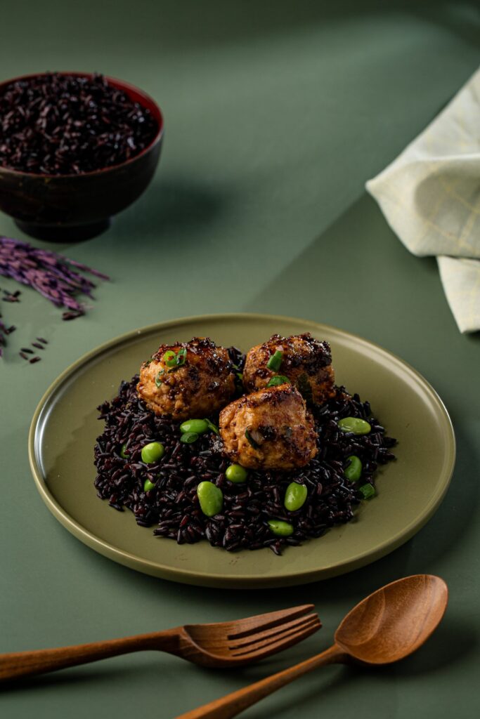 Soy-Ginger Meatballs with Jasberry Organic Ready-to-Eat Superfood Rice