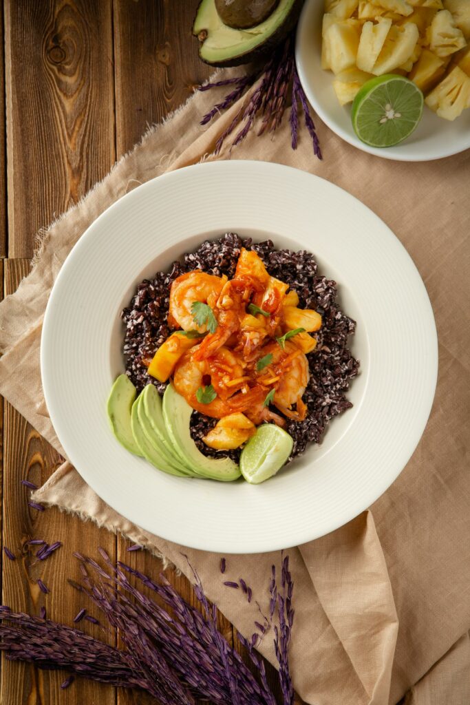 4. Serve the shrimp and pineapple over the Jasberry Rice Coconut. Garnish with sliced avocado, cilantro, and a lime wedge. Enjoy!tions goes here