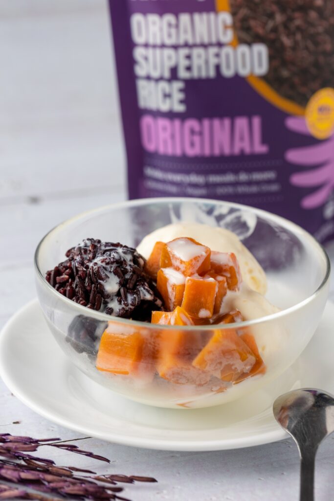 2. Pour the mixture into two bowls. Add a scoop of Jasberry Organic Ready-to-Eat Superfood Rice Original to each bowl, along with a scoop of vegan ice cream and some sweet potato.